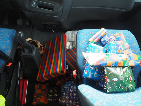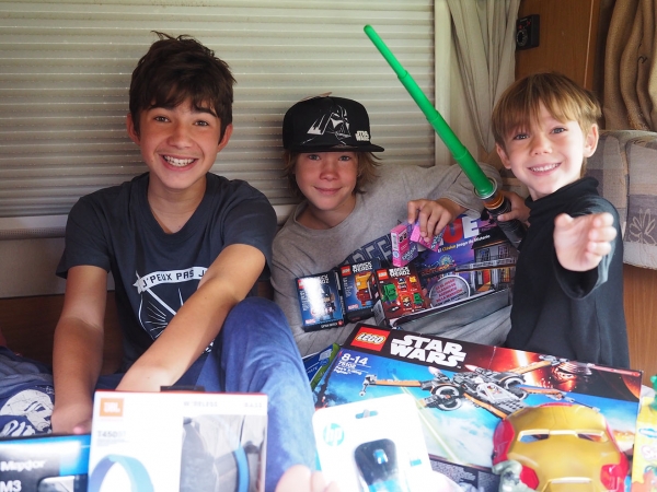 Fort heureusement, le père Noël ne nous a pas oublié dans notre parking boueux, et à notre réveil, nous avons retrouvé un monceau de cadeaux sur le siège avant passager ! (« un peu moins que les autres années » diront les esprits chagrins, mais « tellement suffisamment » diront les sages qui s’évertuent à les ranger régulièrement).