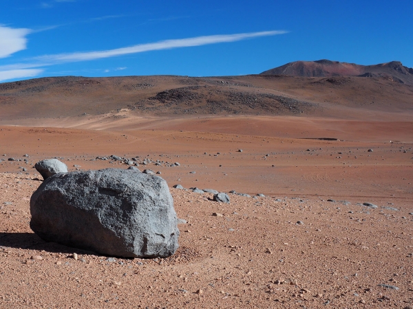 La nuit est froide et toujours pas de chauffage (pour économiser le gaz), autant dire que nous ne prenons pas de douche non plus … C’est un euphémisme de dire que nous repartons un peu tendus à l’assaut de notre itinéraire bis. Rapidement la piste s’avère caillouteuse et très très peu fréquentée. En l’absence de sable, notre principal problème réside dans notre faible garde au sol (que nous appelons donc la hauteur du véhicule mais cela peut porter a confusion, donc il s’agit de la distance entre le sol et le châssis). L’idée est donc dans la mesure du possible pour Bertrand de rouler non pas dans les traces des autres véhicules (pour ne pas rester planter sur le ventre comme une tortue ou pire d’abimer le carter moteur avec des roches), mais au contraire d’un coté sur le terre-plein central et de l’autre sur le bas coté. C’est assez pénible et parfois très périlleux de rouler en équilibre à l’extérieur des traces des 4×4. Nous avançons péniblement, secoués d’un coté sur l’autre, guettant le haut des cols, chaque kilomètre parcouru nous rapproche du Lac Colorada et de la piste principale à laquelle nous aspirons car plus fréquentée et probablement plus praticable (que nous pensions !).