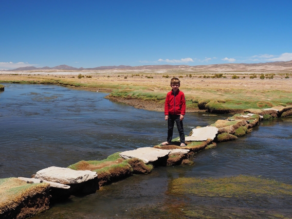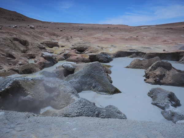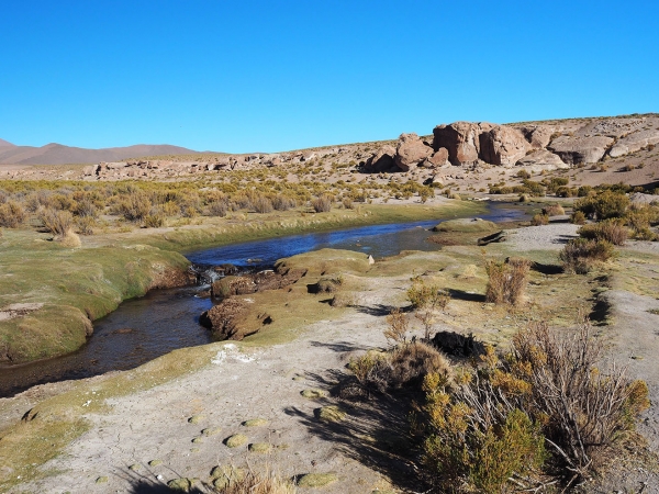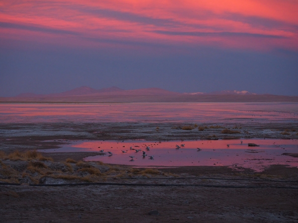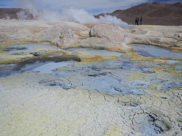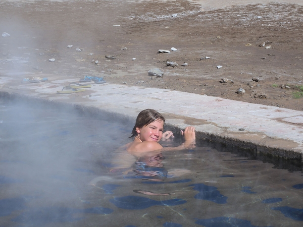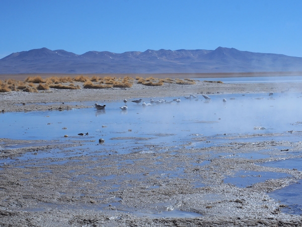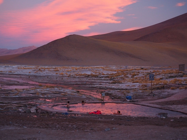 Finalement nous retrouvons la piste principale et après une heure de route nous arrivons enfin aux sources chaudes où nous devons passer la nuit. Autant dire qu’après cette journée rocambolesque, un bain dans l’eau brûlante, avec au loin le soleil couchant sur les montagnes ocres du Sud Lipez, a la saveur des meilleurs SPA du monde …