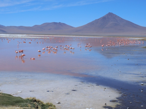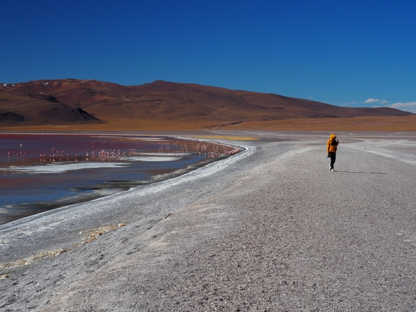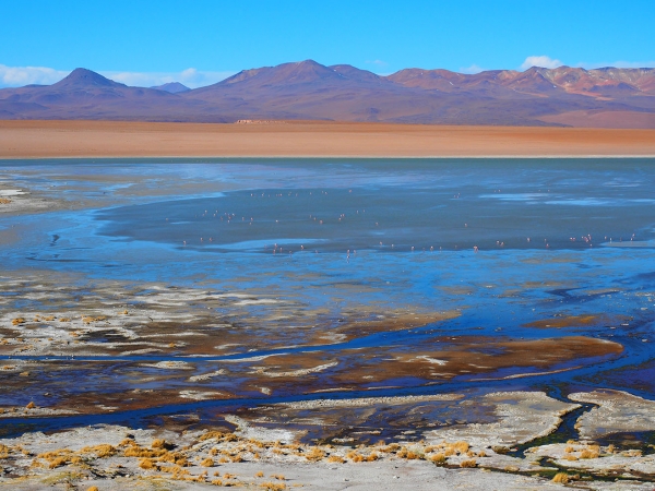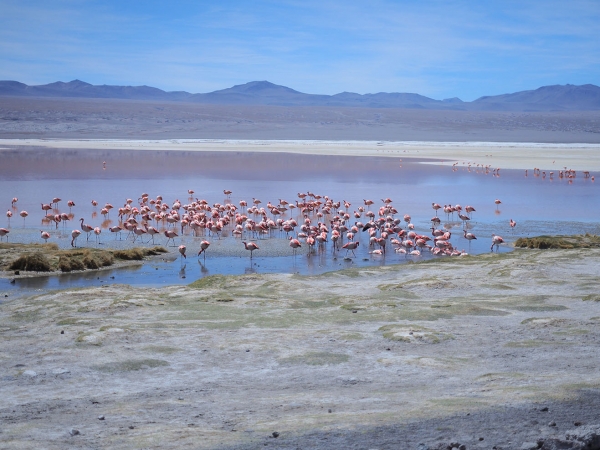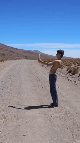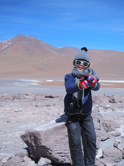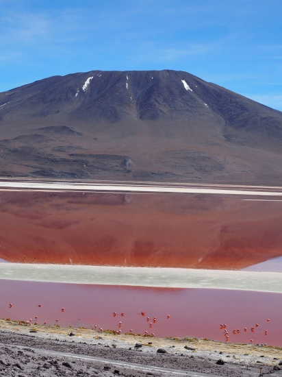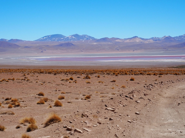 Les paysages sont sauvages et magnifiques mais nous sommes trop tendus et secoués pour en profiter pleinement. Les enfants qui restent indifférents, partiellement au paysage et totalement à la probabilité que nous nous soyons fourvoyés dans une galère sans nom, sont néanmoins obligés de s’accrocher à leur tablette pour ne pas valdinguer de leur siège. Nous apercevons enfin de loin le Laguna Colarada, l’immense lac rouge, qui est notre étape du soir et en profitons pour déloger un caillou qui a déchiré un pneu arrière, nous pouvons rouler sans problème car les roues arrière sont jumelées, par précaution, Bertrand change la roue et nous poursuivons encore quelques heures autour du lac (nous roulons toujours très lentement et le lac est plutôt vaste).