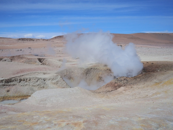 Bref, nous repartons sereins le lendemain matin vers les sources d’eaux chaudes que nous attendons impatiemment pour nous « laver ». Bien que nous roulions doucement et prudemment, nous profitons pleinement de la matinée et faisons un petit détour vers des geysers naturels qui se situent (mais nous ne le savons pas encore) … dans une cuvette ! Nous empruntons donc une piste secondaire qui s’avère être la pire que nous ayons prise. Bertrand m’avertit rapidement qu’il ne pourra pas faire demi-tour et que nous devrons prendre l’autre piste qui mène aux geysers pour regagner la piste principale (la piste descend fortement au milieu de gros cailloux et de profondes ornières).